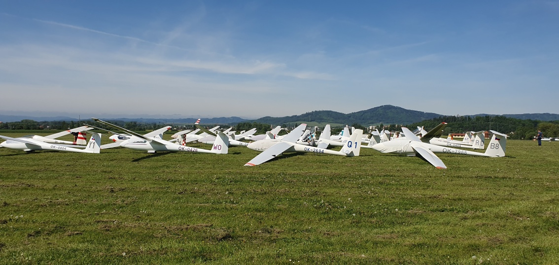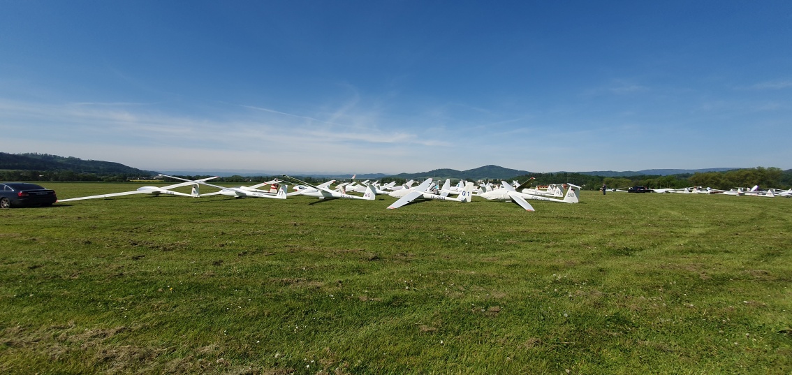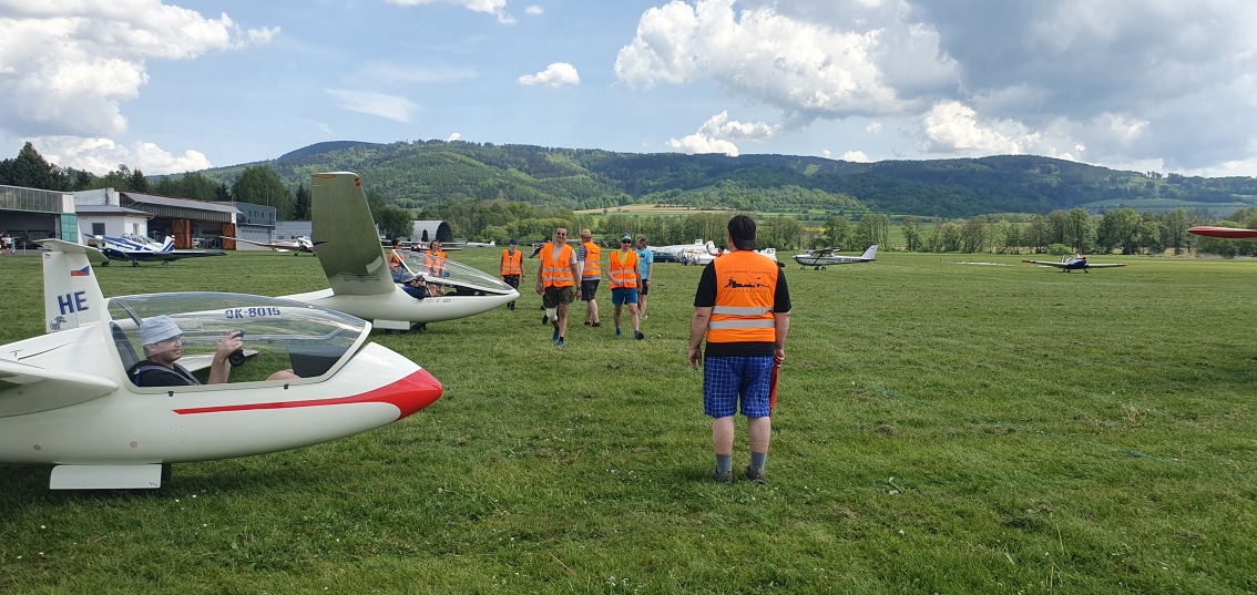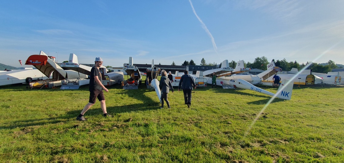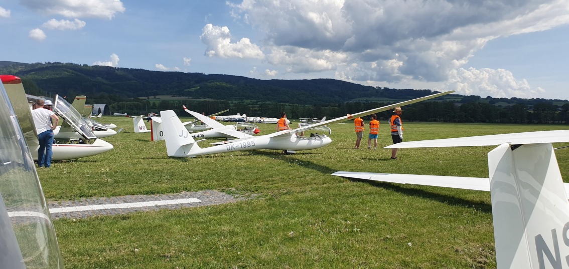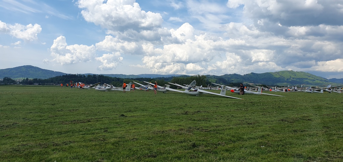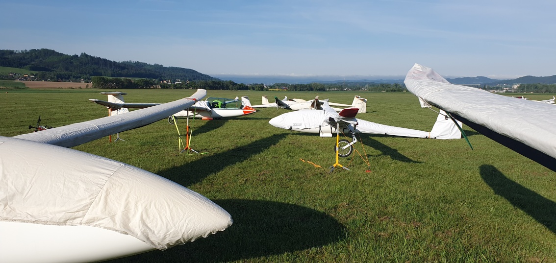 probudili jsme se do slunného dne, vypadá to že počasí nám první letový den přeje.  Stavíme grid na dráze 18, pomocníci rovnají klubovou třídu dle vylosovaného pořadí. Za ní si piloti kombi třídy chystají své stroje k dnešní letové úloze.
